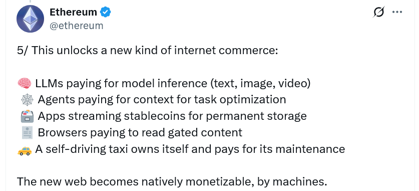 Duo’nun X paylaşımında, otonom ajanların “Ethereum’un en büyük güç kullanıcısı olabileceği belirtildi. Coinbase, HTTP 402’yi” X402 Ödeme Protokolü “aracılığıyla zaten uyguladı.